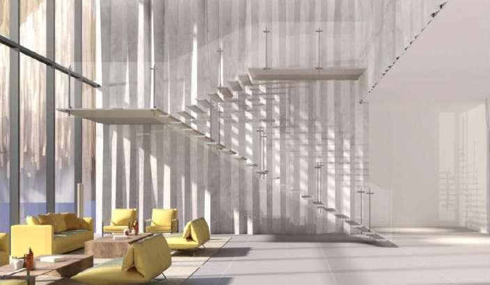 The external façade grille penetrates the glass to form a landscape surface from the inside of the hotel lobby. The material of the indoor staircase guardrail is the same as that of the external facade