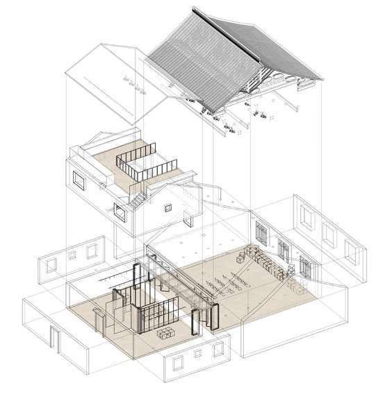 The architecture of the project works with the archetypal form of the house: a unique volume covered with a pitched roof of traditional tiles. This volume is then perturbated by the addition of four prominent steel boxes.