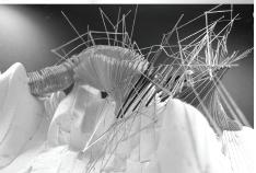 The l andscape of this project becomes A visual tr ansl ation of sound. We recorded at 25 different locations to map out the sound profile over the site. Each sound wave plot ted and then tr ansposed on to high density sheet of foam. Each sheet was then l ayered together forming a series of sharp peaks and valleys. Through a lengthy process of intense sanding a smooth lunar like surface emerged.