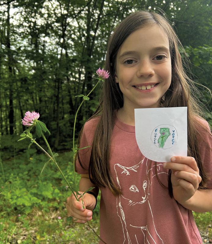 ELLA BROWN, 9, of Newfane completed activity No. 1 after she created her very own new “Future Voter” sticker. “I drew the shape of Vermont with a red clover inside (state flower) and blue ‘future voter’ on the sides,” she said.
