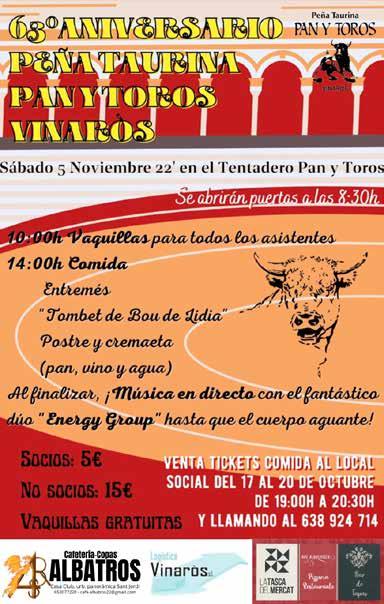 Los tickets para la comida podrán adquirirse del 17 al 20 de octubre en horario de 19:00h a 20:30h en el local social de la Peña y el en el teléfono: 638924714.