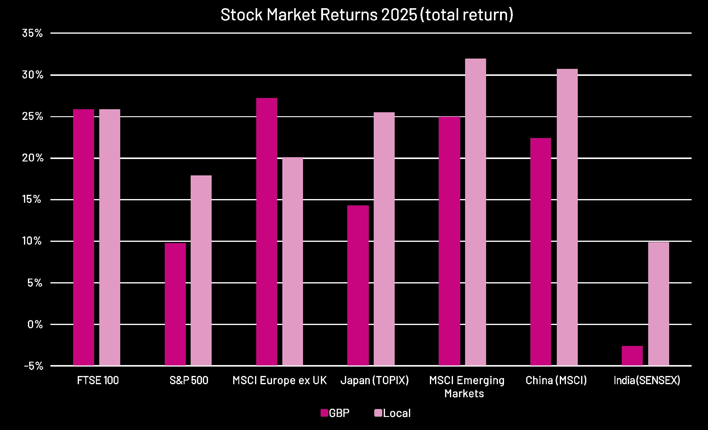 Measured in sterling terms, the best performing equity regions in 2025 were Europe (+27%), UK (+26%) and Emerging Markets (+25%).