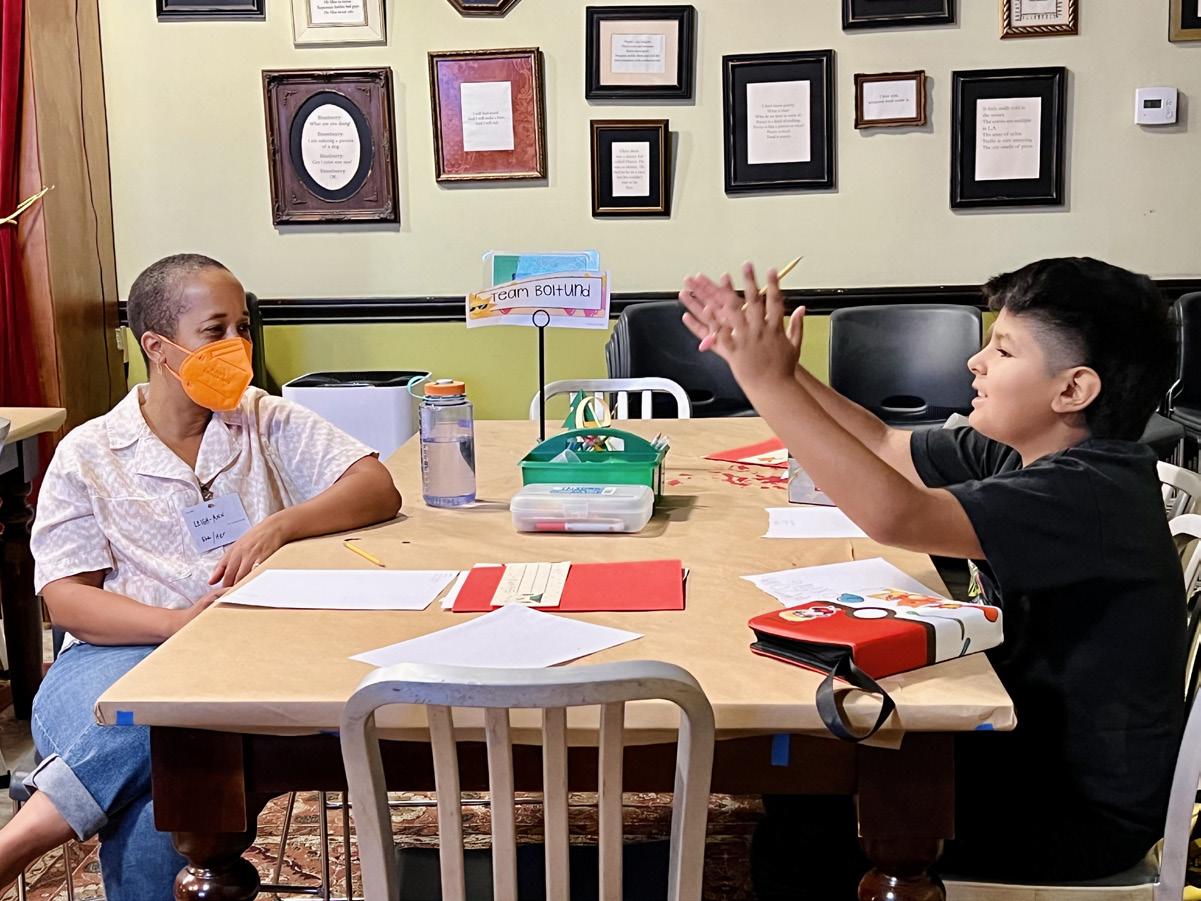 After more than a year of Zoom tutoring, our After-School Tutoring (AST) program for younger students, and our Tuesday and Thursday Night Tutoring (TNT) program for older students welcomed participants back in person beginning in the fall. It was a joyous reunion, with lots of hand sanitizer—and more writing than in our virtual era, as students resumed the Write On! portion of each session, in which they responded to creative prompts.