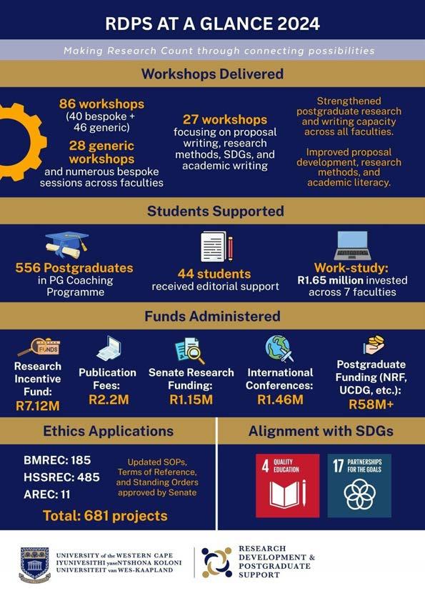 The Research Development and Postgraduate Support Directorate (RDPS) continues to embody UWC’s vision of a people-centred, collaborative, and purpose-driven research ecosystem. Its integrated approach, combining mentorship, partnership, digital innovation, and ethical stewardship, has reinforced UWC’s role as a hub of postgraduate excellence and transformation.