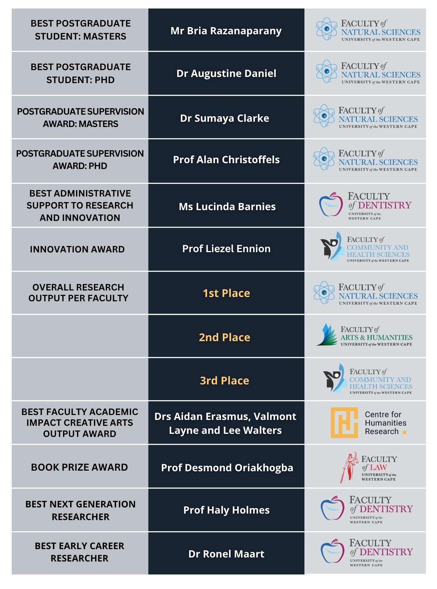 3. Strengthening UWC’s Research Profile: Recognition through these awards showcases the University’s research and innovation strengths to both internal and external audiences.