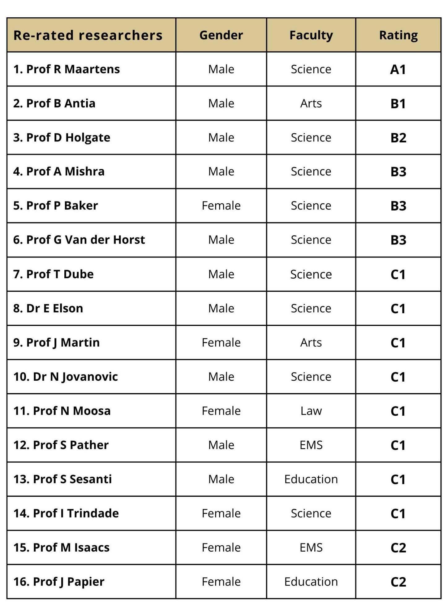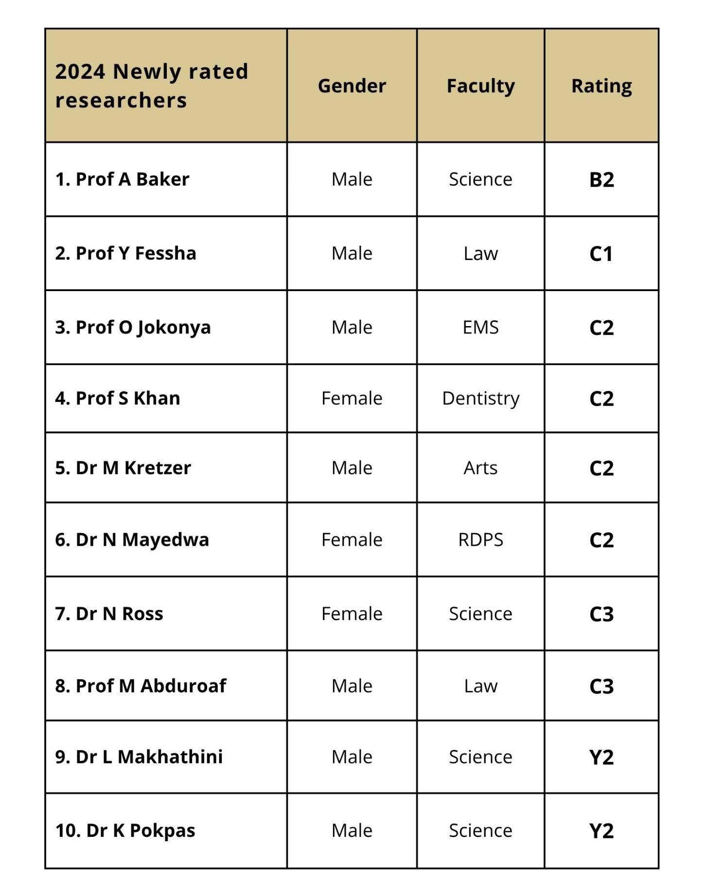 Ratings are awarded based on a rigorous evaluation of a researcher’s recent body of work typically over the past eight years by both local and international peers. This process not only measures research output and influence but also highlights individuals who are recognised as leaders in their respective fields.