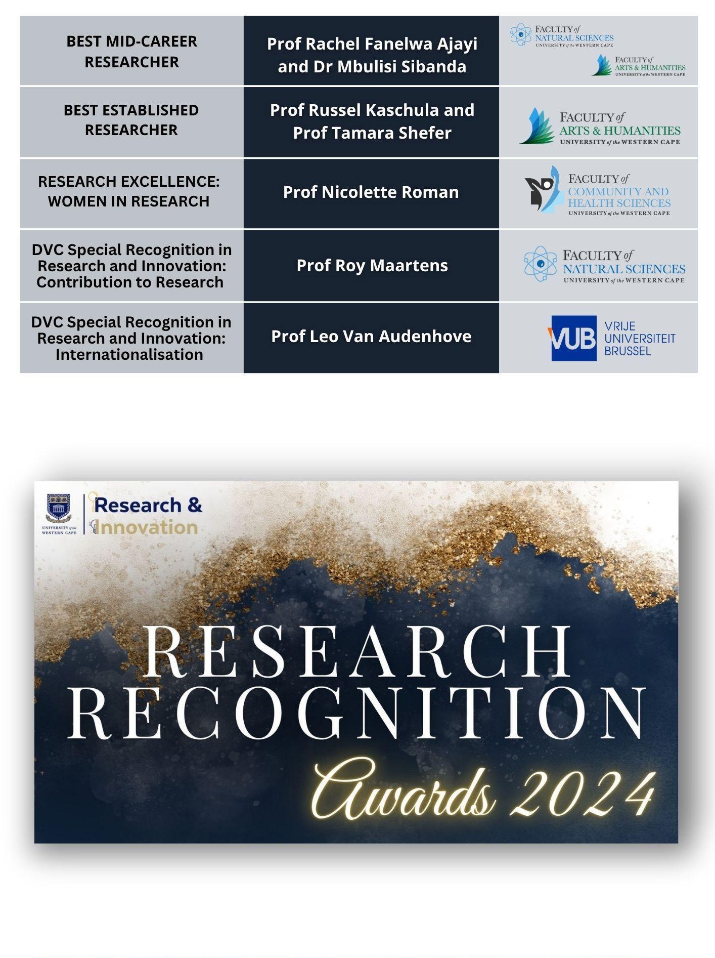 The following sections highlight the recipients of the 2024 Research Recognition Awards across multiple categories, reflecting the breadth and impact of research excellence at UWC.