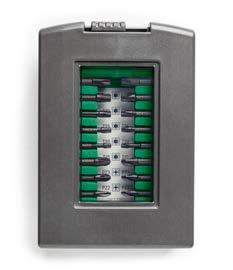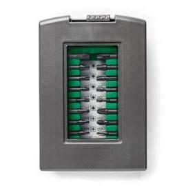 Med 2 st 2,0Ah Li-ionbatterier, laddare, snabbchuck, bitsadapter, vinkelchuck, excenterchuck, bälteskrok, bits och stapelbar förvaringsväska HSC II.