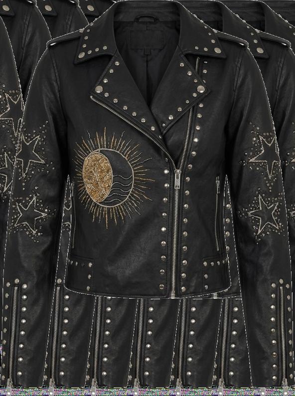 - Embellishments: Features a prominent gold sun and crescent moon motif on the right chest, accented with radiating stitch lines.