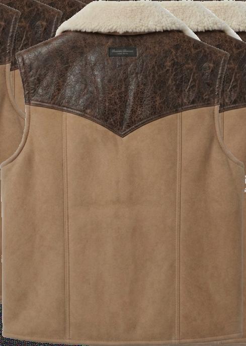 - Material: Mixed-media construction utilizing a tan suede main body contrasted with dark brown leather panels on the shoulders.