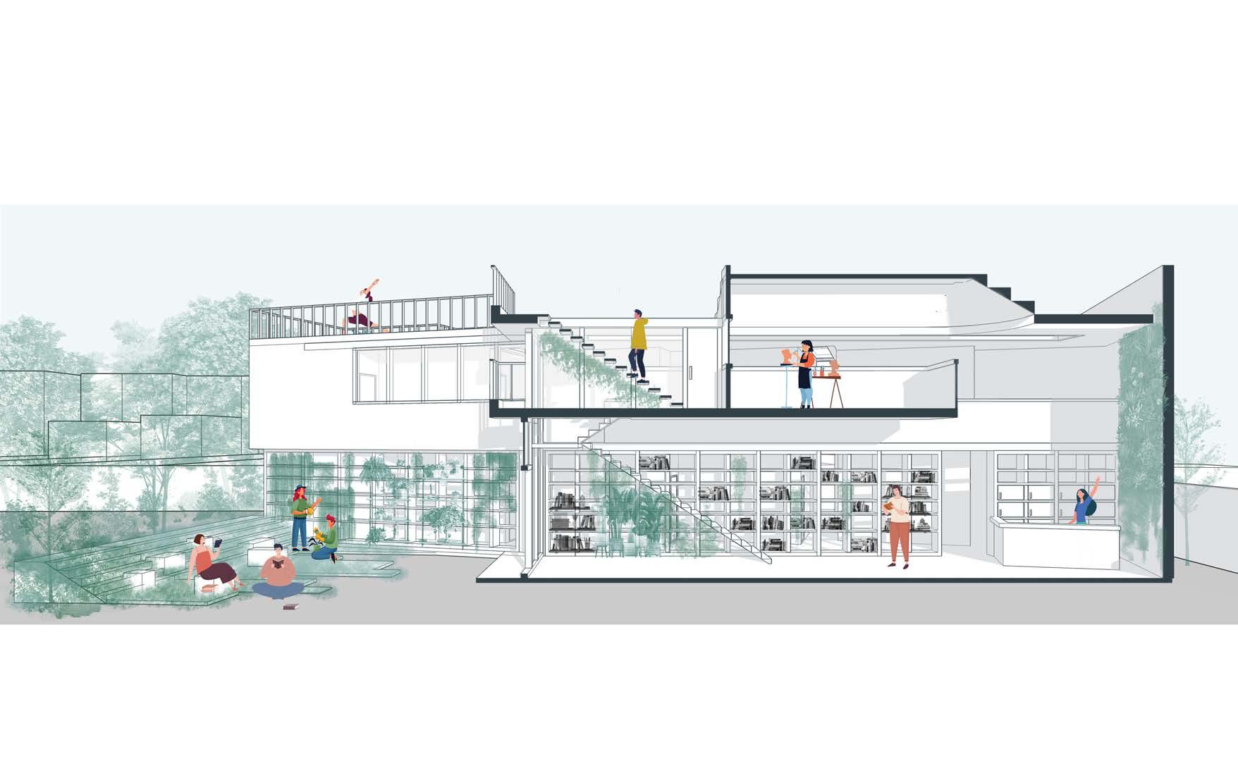 ‘bookshelf’ that extends from interior to exterior to perform different functions, it also ensures a sense of openness and permeability that is central for community living. Staircases are not just for circulations, but also for creating boundaries, views and resting places. The incorporation of roof space creates ample shared spaces, which encourages collaborative and creative activities. The enclosed courtyard forms a conversation with the adjacent church greenery while mini interior gardens between the rooms introduce more nature and light.