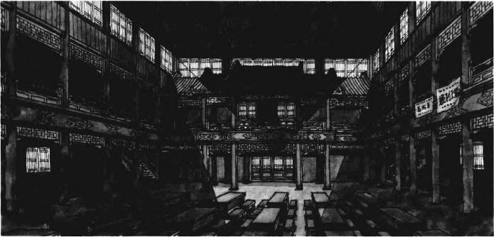 The Peking Opera House is the most significant public space featured in Farewell. Similarly to the street, it quite literally becomes the 'theatrical backdrop' of the frontstage panorama. The interior of the opera house is a set (Fig. 13) which has referenced Huguang Guild Hall and Yangpin Guild Hall (Fig. 14) (Yang, 2010).