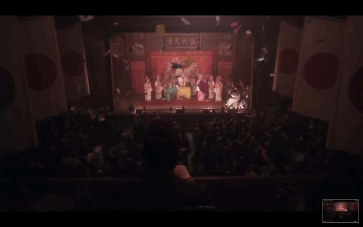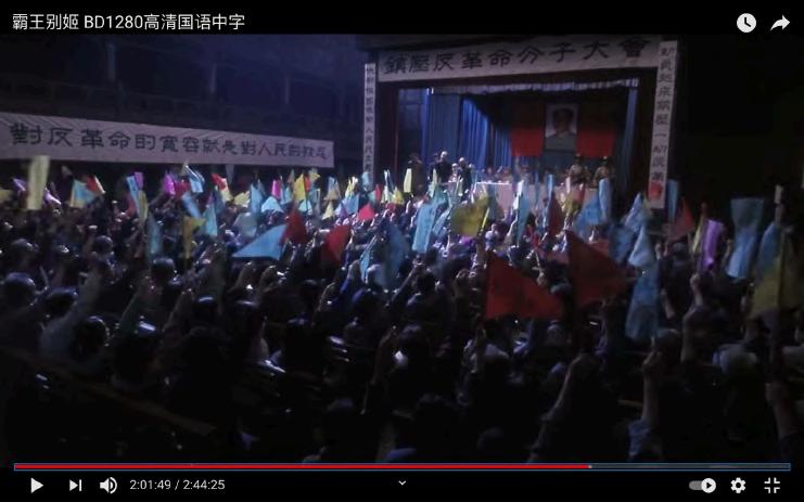 While the architectural skeleton of the opera house remains largely similar, the Mise-en-scène makes the historical changes readily visually comprehensible. In comparably more peaceful times while the film first started - 1925, a time of warlords' rule and the heyday of the Peking Opera, the flags hanging from the second-floor wooden railings often imprint names and praises of the opera performers. As China swirls into the later historical turmoil from the Japanese invasion, the takeover by the Nationalist party and the inexorable rise of the Communist Party(Fig. 15, 16, 17), the worship of individuals certainly had to give way to that of the collective power struggle. Regardless of the group in control, hanging of the national/party flag seemed to be a common way of exerting dominance in the space which itself embodied a dual function of public gathering and power display, with the opera art having both royalist and bourgeois origin and grassroots popularity. The resurgence of similar scenes also elevates the notion of the past as a vicious cycle or a wanton process under the mercy of the supervising regime(Ma, 2003).