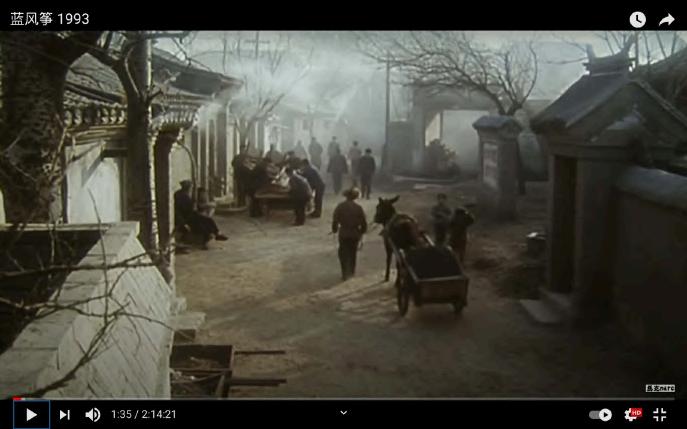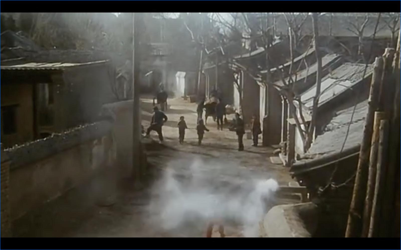 Similarly, such ambience of familiarity and deja-vu is also created in the streets of Blue, which employed location shooting rather than studio sets. A street in the bustling residential corner of Beijing constitutes the first few scenes of the film(Fig. 3) The voice-over of an adolescent narrator speaks in a nasal tone, introducing Dry Well Lane (Ganjing Hutong), the stage on which intricate personal, social and political relations are about to converge. There indeed exists a Dry Well Lane in Beijing yet it is not clear from the film itself whether associations can be made to the real site – the director might have just borrowed the name as the photography has omitted any traces of site-specific information. Often shot from a bird's eye view, everything seen in the setting - chimney and smoke in the coal-burning winter of Beijing, a cart pulled by a donkey and children playing on the street – gives rise to a sense of the timelessness, eternal, ordinary folk's Beijing.