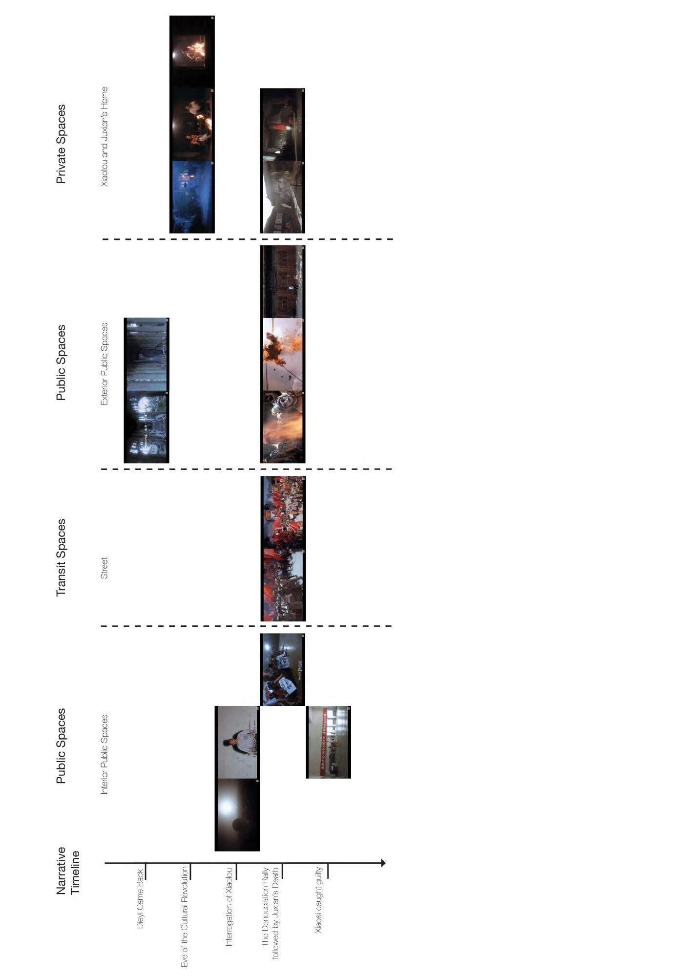 Similarly, the dramatic intensities of memory are also reflected in the spatial-temporal assemblage of Farewell. Figure 4.2 covers the period from the start of the Cultural Revolution to the end of the film. Most spaces in Farewell contain one stand-alone event and hence are less associated with each other. This allows Chen to make use more of symbolic spaces unlike that of the everyday spaces in Blue, such as the movie theatre with a strong spotlight where Xiaolou was interrogated, and the dance practice room full of mirrors where Xiaosi was caught guilty by other red guards. These spaces are usually sufficiently visually and symbolically simulating themselves and additional association with other spaces might only release the tension contained. Even when spaces are indeed associated, it is by less of a cause-effect relationship but more in terms of a temporal relationship based on character movement. For example, the first scene of Dieyi returning on the eve of the Cultural Revolution is followed by the scene of his arrival at Xiaolou's house – the two spaces, although disparate, are linked through an inferred continuous journey.