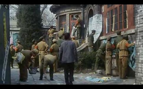 Interpreting party policy and political message is a constant necessity for survival (Wang, 1999), as posters in the family are changed in accord with the ideology of different party movements(Figure 33). As the film reaches its climax where Tietou's stepfather was carried out of the house by the red guards for a denunciation rally, big-character posters (dazibao, ⼤字报) have completely carpeted both the interior and exterior of the once peaceful and tranquil home(Figure 34). While evoking the common experiences of many homes being completely vandalised during the Great Leap Forward period, the overwhelming spatial semiotics in the scene also represent the sweeping and relentless force of the Cultural Revolution that has completely acquired the private into the public sphere, thus reenacting the memory on both symbolic and physical level.