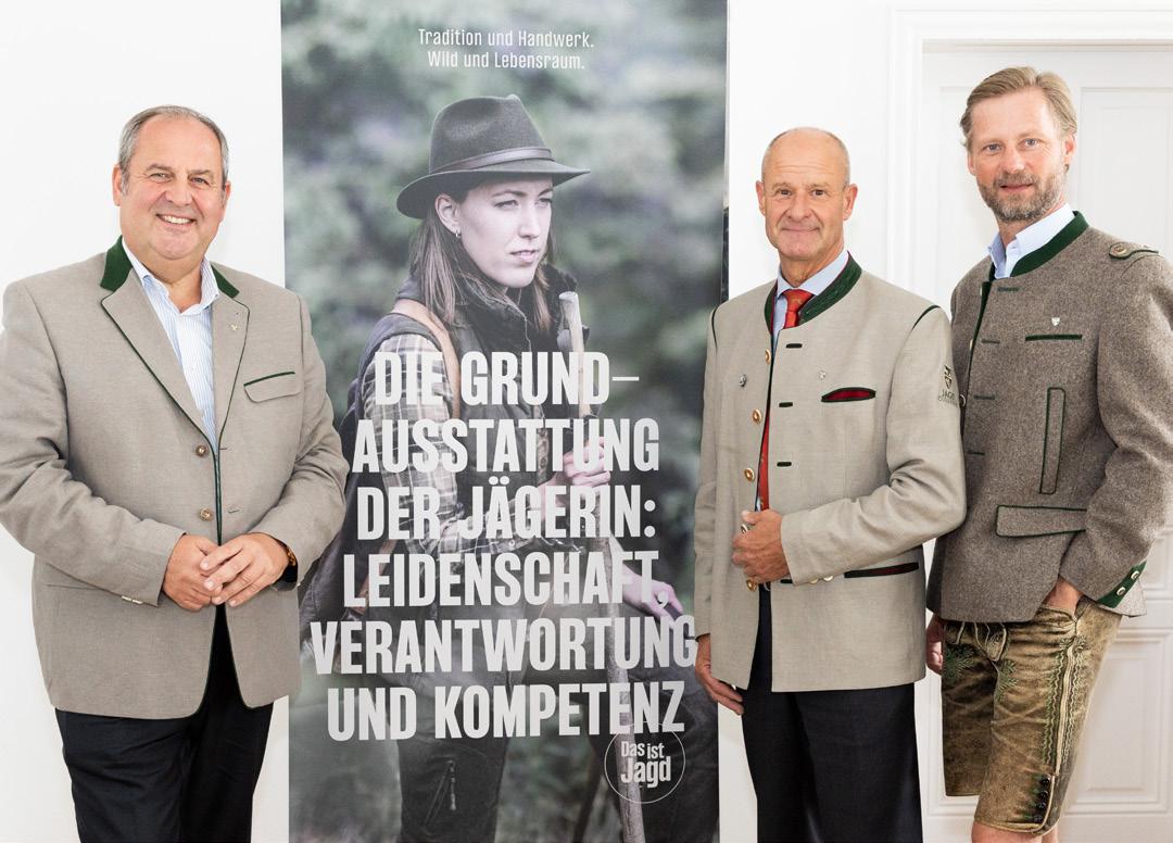 Das Präsidium von Jagd Österreich 2023 präsentierte den Medien die Infokampagne und die ersten Sujets. Von links nach rechts: Präsident des Vorjahres LJM DI Josef Pröll, Niederösterreich, Präsident LJM Herbert Sieghartsleitner, Oberösterreich, und der kommende Präsident LJM Max Mayr Melnhof, Salzburg. Foto: Anna Rauchenberger