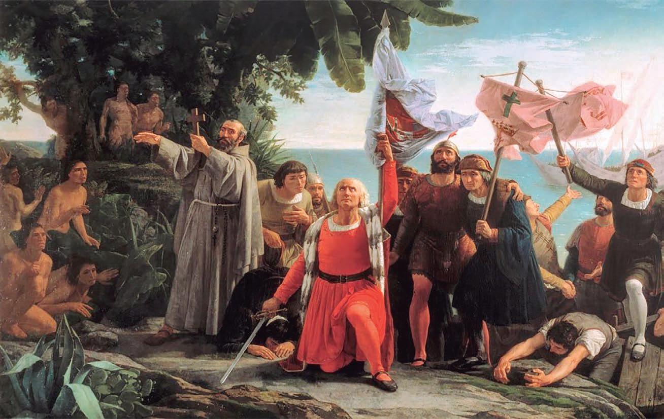 Pintura del primer desembarco de Cristóbal Colón en América, de Dióscoro Puebla, 1862.