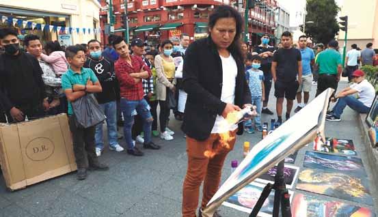En el Paseo de la Sexta Avenida de la zona 1, desde hace aproximadamente 7 años, el artista guatemalteco se rodea de las personas que admiran sus creaciones. Al ritmo de la música y con sus instrumentos forma curvas, líneas y colores. Ha dibujado y pintado montañas, lunas, dragones, unicornios, paisajes, a Cristiano Ronaldo, Lionel Messi, Ro naldinho, entre otros; con la ayuda de los espráis, pinceles, el papel, la esponja y más.
