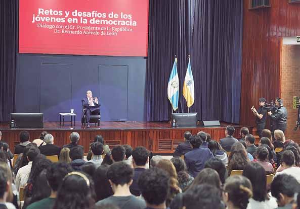 “Necesitamos que la juventud rescate la política para su sentido público, que la salve de las manos de quienes la han aprovechado como mecanismo de enriquecimiento personal”, a rmó el presidente Bernardo Arévalo durante el diálogo sobre Retos y desafíos de los jóvenes en la democracia, efectuado ayer con estudiantes de la Universidad Rafael Landívar (URL).