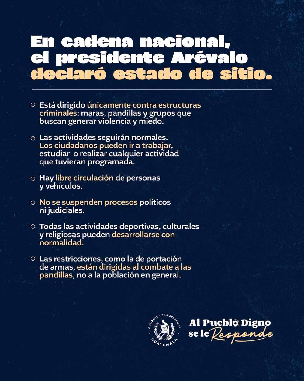 El Legislativo rati có ayer el Estado de Sitio decretado por el Gobierno por 30 días para garantizar la seguridad de los guatemaltecos, luego de una serie de ataques terroristas de pandilleros que dejó 10 agentes de la Policía Nacional Civil (PNC) fallecidos y a otros, heridos.