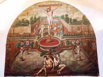Por otro lado, está La Fuente de la Divina Gracia, de autor desconocido, de 4.40 metros de ancho con 3.83 de altura. En el cuadro se observa a Adán y Eva, junto a la serpiente como símbolo del pecado original; al centro, Cristo Crucificado, de mayor tamaño.