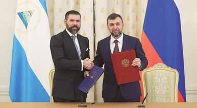 El representante especial nicaragüense destacó que es un “honor muy especial poder rmar estos acuerdos de cooperación con estas regiones y repúblicas que han soportado los embates, ataques fascistas en contra de sus pueblos, en contra de sus culturas, que han atentado contra la vida de sus ciudadanos”.