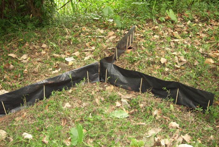 實際該怎麼做呢?我們從助教那拿 到了材料後,首先,我們先定出坑洞 的位置,並且開始挖洞,放入塑膠桶 作為陷阱,收集動物的容器,再來就 是蠻主要的部份,也就是建立誘導通 道,我們會將紙板固定、立在坑洞周 圍的三個方向,並且要將紙板周圍的 地整平,使紙板可以跟地面切齊,為 的就是要讓小動物可以受到阻擋,而 沿著紙板走進陷阱內,再來就是把紙 板用竹筷固定了。如此一來,一個簡 易的掉落式陷阱就做好了,當然你也 可以用附近的落葉幫這個陷阱布置一 下,讓它更自然一些喔!