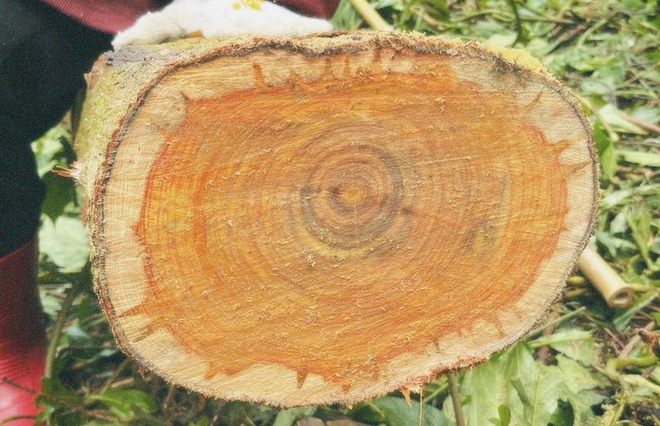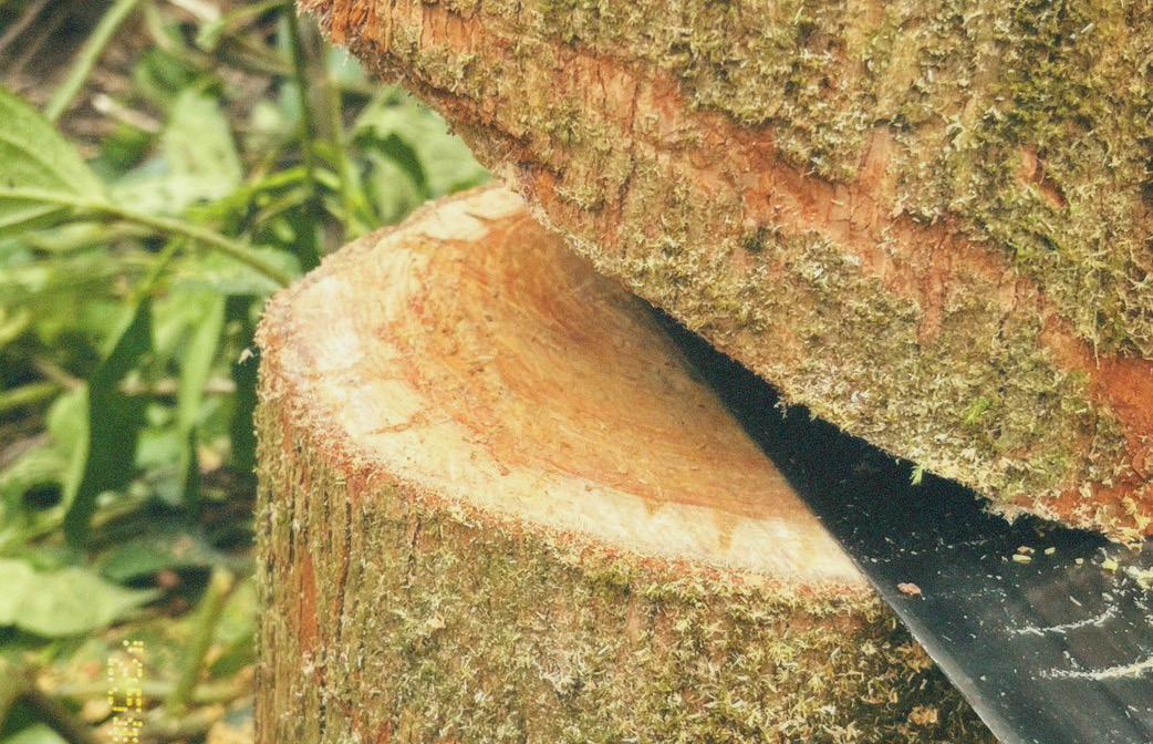 開始出現開裂聲響,代表它快要倒了! 這時候就需要有人吹哨提醒大家注意 安全,其他人也要往倒樹方向的反方 向快速分散。最後就是打印,在樹木 上打上記號,以示合法的砍伐活動。