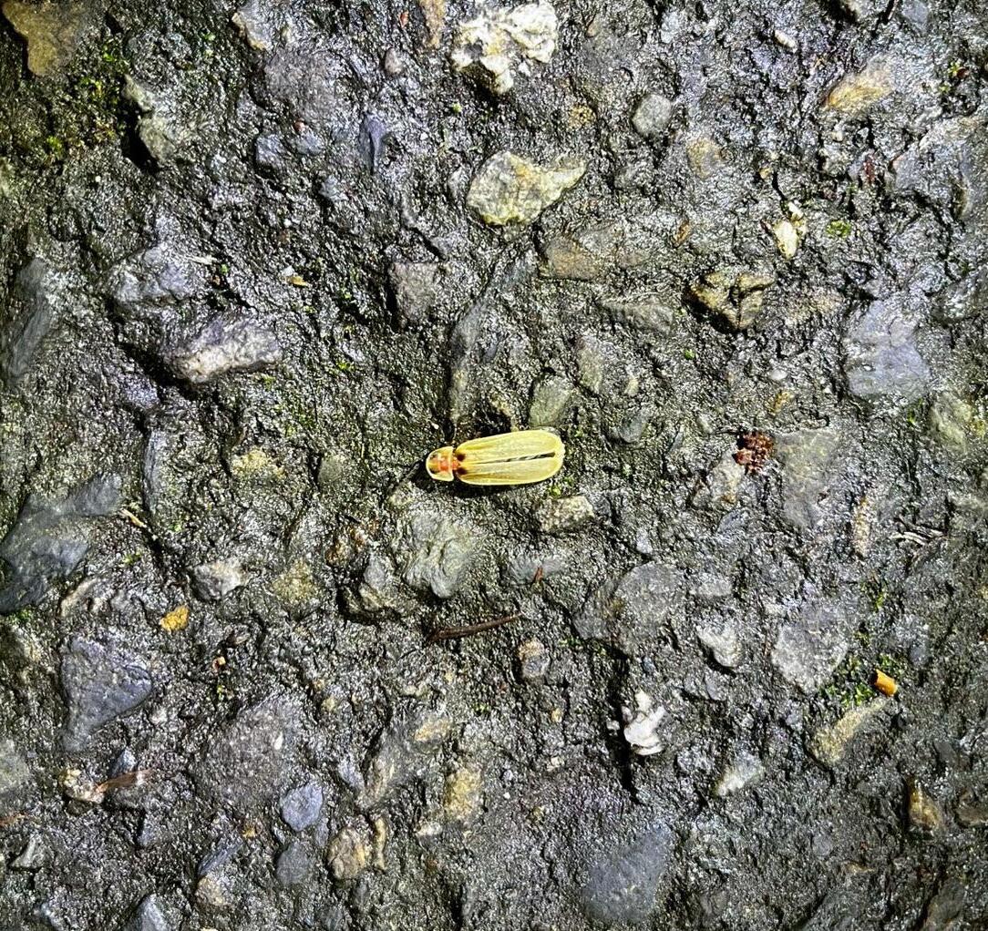起初,我們走在溪頭園區裡的柏油 路上,走了許久,我們用手電筒照向 四周,試圖透過不對勁的反射,判斷 是否為動物眼睛的反射,藉此找到這 些隱藏於黑暗中的動物們,但遲遲沒 看到半隻稀有的動物。而就在此時, 我突然隱隱約約在忽明忽暗的路邊發 現了奇怪閃爍的黃綠光點,原來是一 隻螢火蟲。雖然在城市中就能在大安 森林公園,這樣經過生態復育的公園 裡看到都市裡的螢火蟲群落,但能在