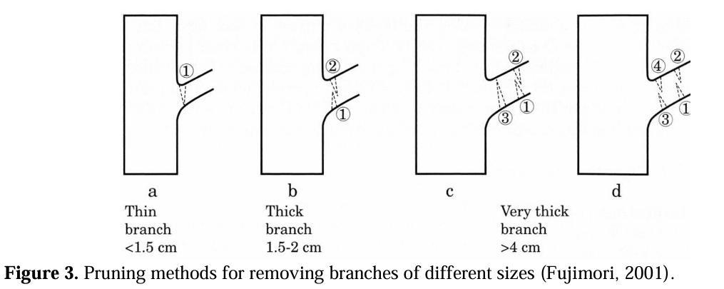 粗枝修剪時,有一套SOP是我們 這次學到的技巧。首先,我們要在樹 枝與主幹交界(稱為枝瘤) 外側的一 段距離下方,先鋸一道切口(1);接著, 在這個 切口上方一點的地方,從上往 下鋸斷整個樹枝(2);最後,再靠近枝 瘤處由下往上鋸斷最後的部分(3)。為 什麼不能直接鋸?因為粗枝太重,如 果直接從上往下鋸,可能會導致樹皮 撕裂,反而傷害樹木本體,影響後續