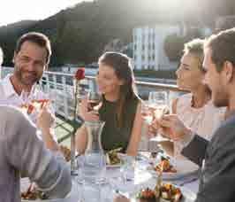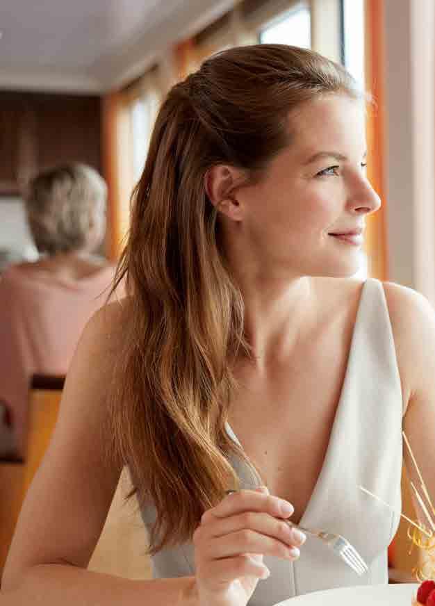 Sich fein machen und Gastronomie vom Feinsten erleben. Mit Wine & Dine können Sie ein exklusives Genuss-Highlight hinzubuchen. In einem separaten Restaurantbereich decken wir den Tisch für Sie und verwöhnen Sie mit einem saisonalen Vier-Gänge-Menü – persönlich vorgestellt von unserem Chefkoch, mit einer vorzüglichen Weinbegleitung durch unsere Maîtres. Das Wine & Dine-Menü können Sie einfach an Bord hinzubuchen. Und wenn Sie noch mehr Winzerkunst und Kulinarik entdecken möchten – unsere Wein- & Genuss-Reisen auf Rhône und Douro sind der reinste Hochgenuss. Auf Seite 42 kommen Sie auf den Geschmack.
