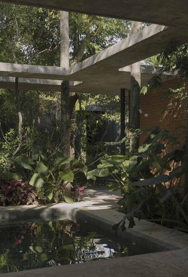 Los árboles delinean la relación entre los espacios ocupados y los vacíos, liberando a la estructura de los sistemas de grilla convencionales y estableciendo un ritmo dinámico que refleja los patrones de la naturaleza. Esta disposición no ortogonal de los pilares contribuye a la estabilidad lateral de la estructura. Los volúmenes sólidos se construyen utilizando bloques de tierra comprimida (BTC), lo que refuerza el compromiso del proyecto con un diálogo material con el paisaje.
