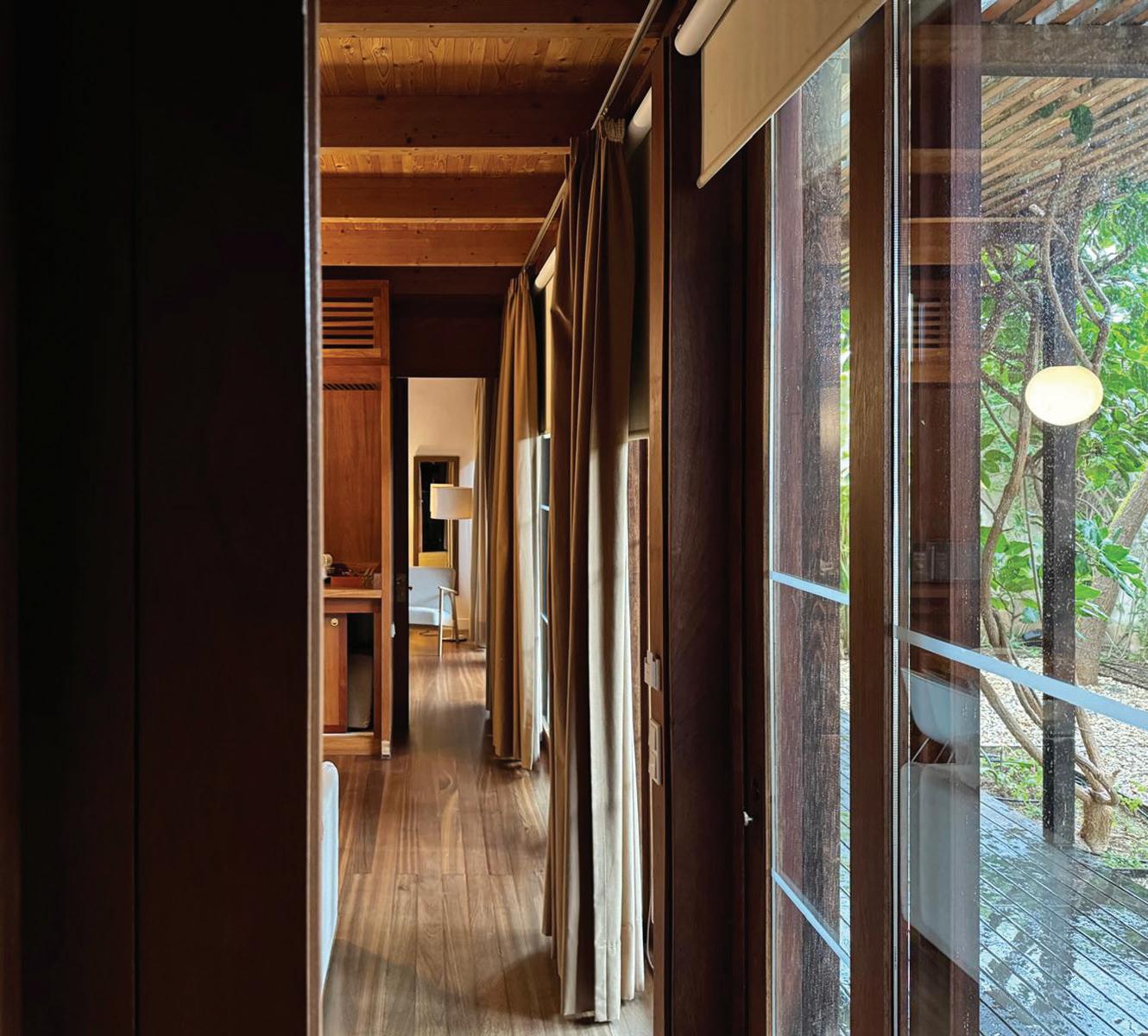The rooms to the north are structured as a sequence of garden-courtyards, generating intimate spaces that privilege serenity and silence, reinforced by the use of natural materials such as wood and marble.
