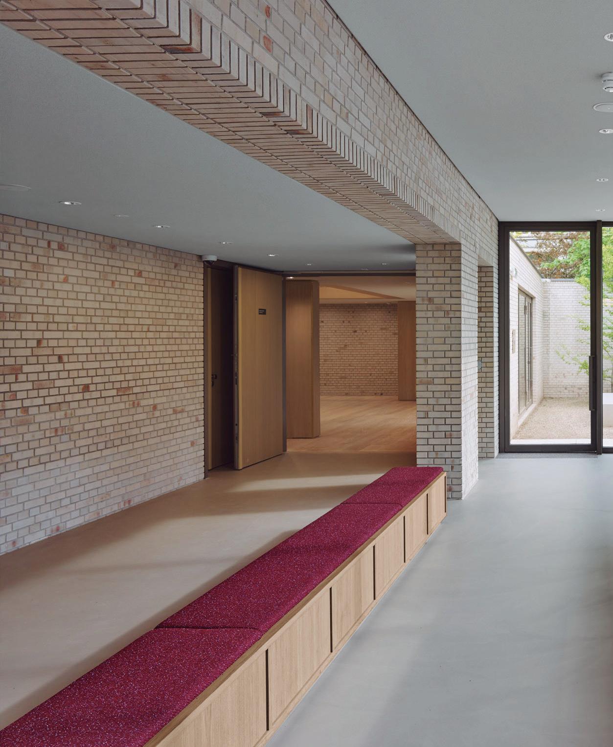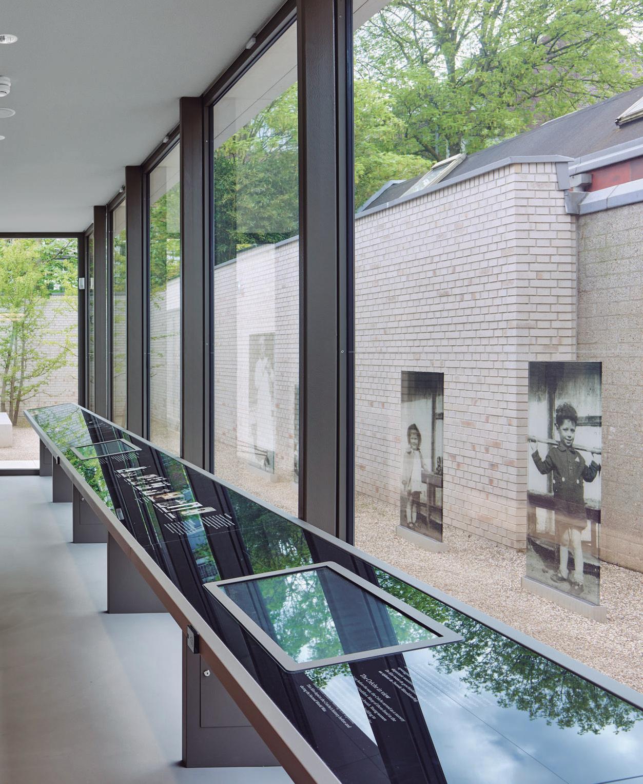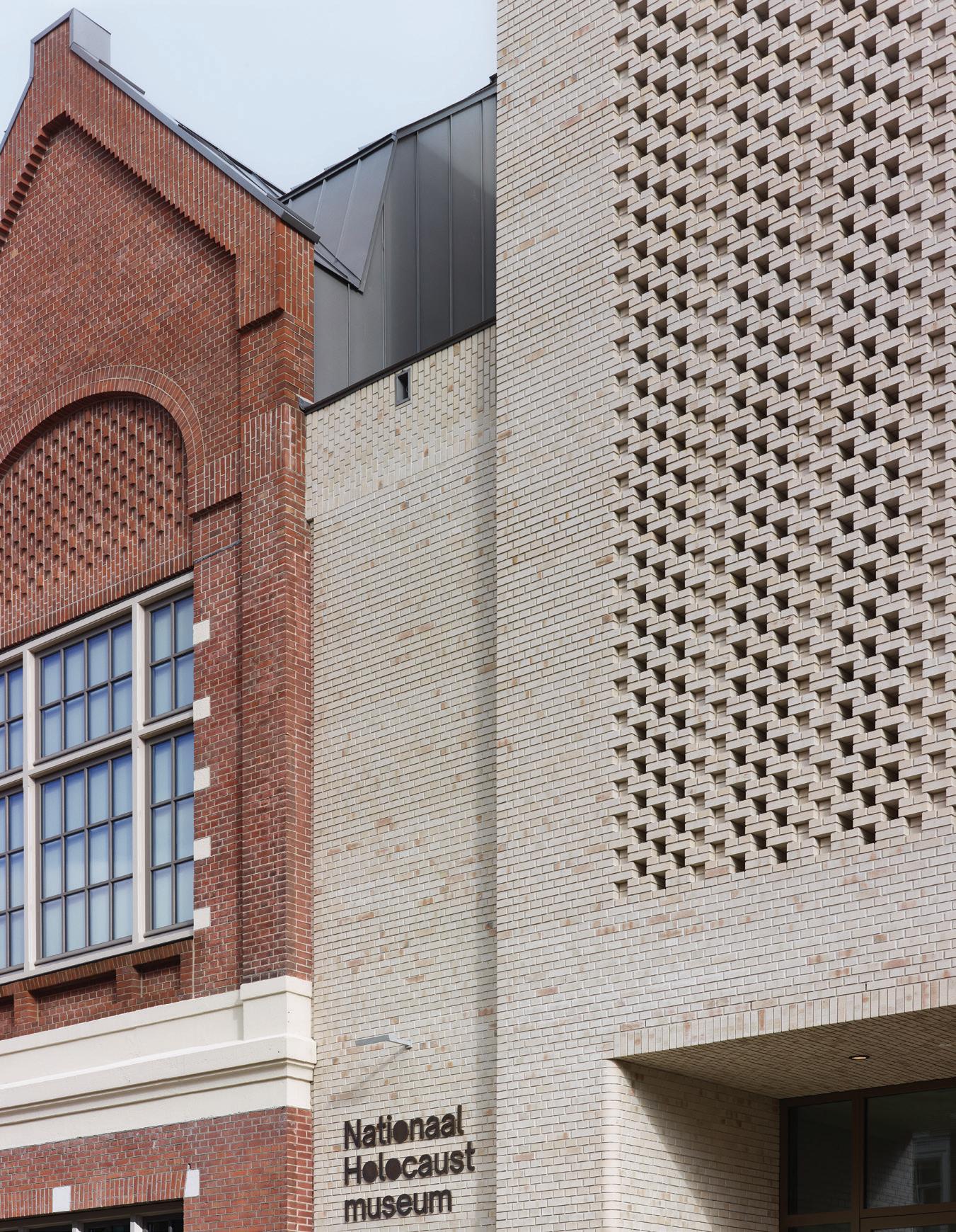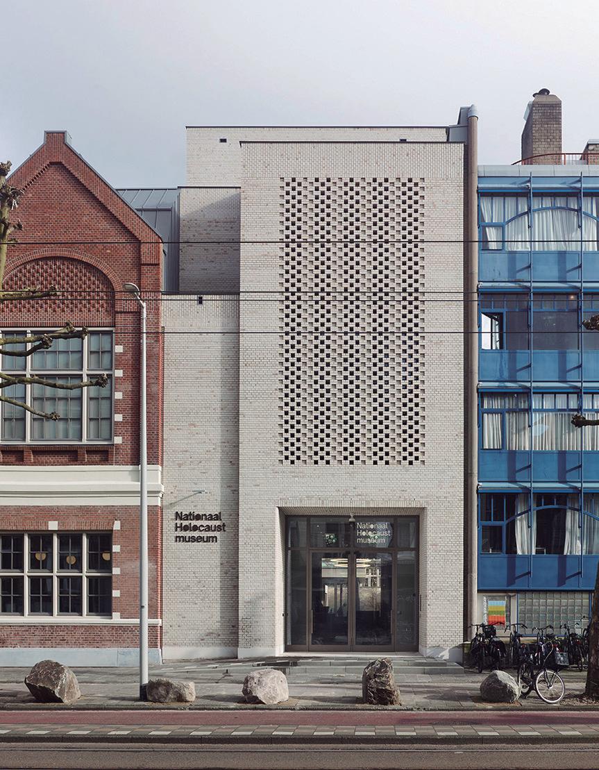 The museumâs robust, contemporary entrance was built on the site of the former residence, using the shell of the postwar building. The rhythm of the new facade reflects the original proportions of the house that once stood there. The white brick complements the original houseâs white accents and the many white buildings along the street. The vertical claustra masonry subtly references the Amsterdam School architecture that characterises many Jewish landmarks in the city. Directly visible from the reception area, where the original garden and the wall to the former crĂšche once stood, an open space now commemorates the childrenâs rescue.