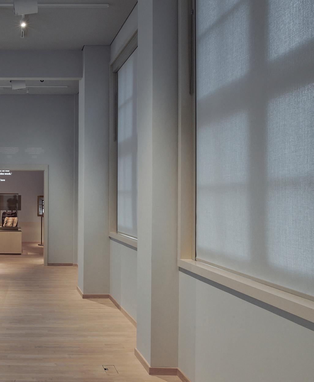 Natural light enters the building whenever conservation regulations allow. Sightlines connect the interior to the street and the opposite theatre, enhancing the narrative. Light, neutral tones and filtered daylight foster a sense of openness while meeting strict lux levels for the collection. Artificial lighting near windows preserves the daylight ambience; even rooms without windows are lit with dimmed backlit glass panels.