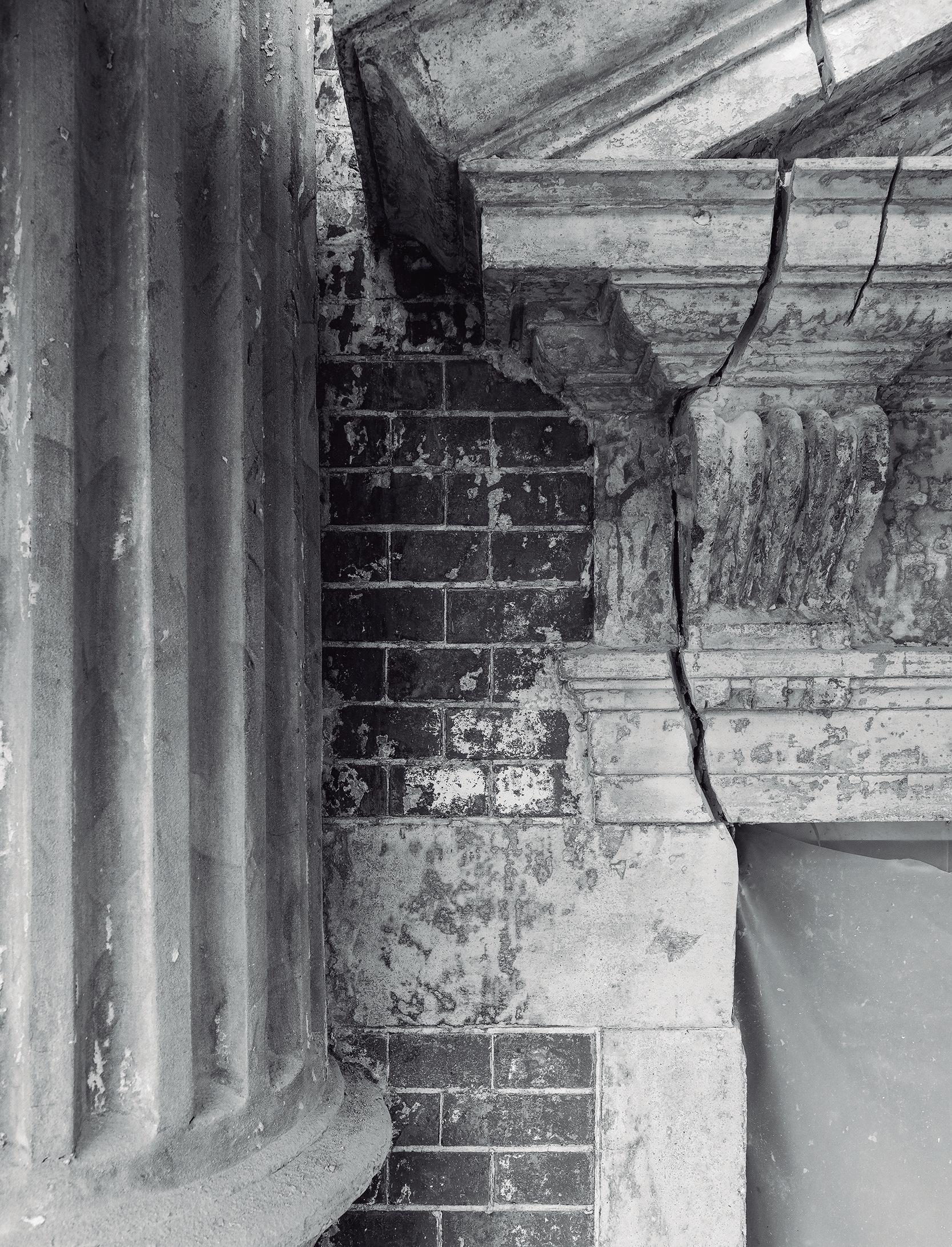 nursery â had made the buildingsâ intertwined history all but unreadable. The approach needed to be more transformative since any visible connection to the child-smuggling operations had long faded. To recover that legibility, the design reintroduced the spatial proportions of the original classrooms and corridors and quietly reinstated the historic facade profile. The facade, significantly deteriorated, was rebuilt in an abstract manner â preserving original sections alongside traces of postwar modifications, with a new masonry gable completing the contours. The building could once again be read as a school without resorting to literal reconstruction.