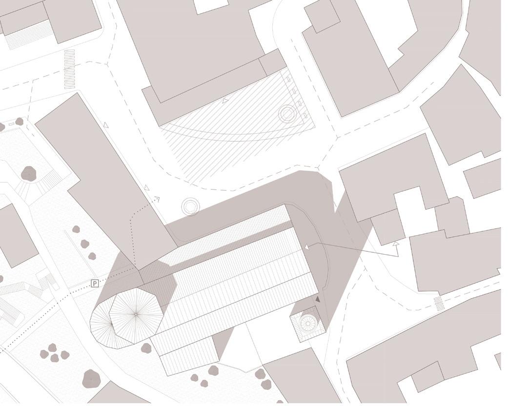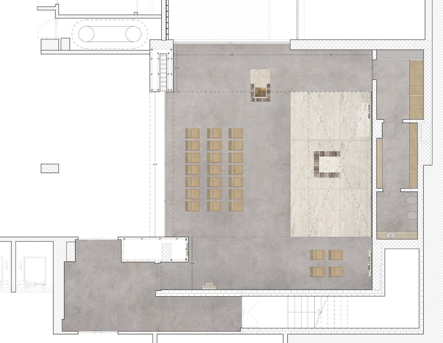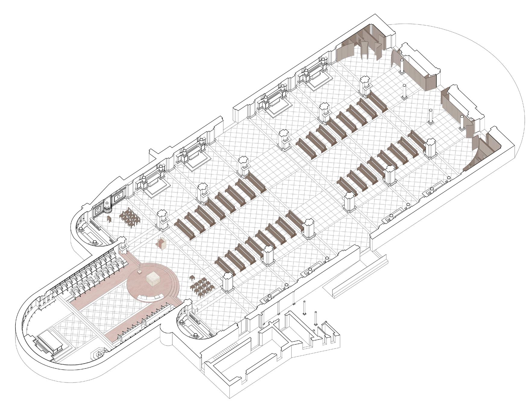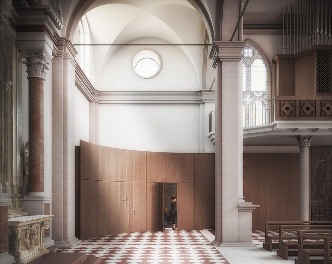 La base del altar, que también contiene la Cátedra del Obispo, la silla para el asistente de ceremonia y el basamento de la cruz procesional, avanza para subrayar enfatizar el rito. Este círculo recupera la proyección de los ábsides laterales, reconfigurando una continuidad geométrica. La contra-fachada se trata a través de un único gesto capaz de contener las puertas de acceso y los nuevos confesionarios, vinculando la percepción interna de forma fluida y uniforme. De esta forma la percepción interna de forma fluida y uniforme.