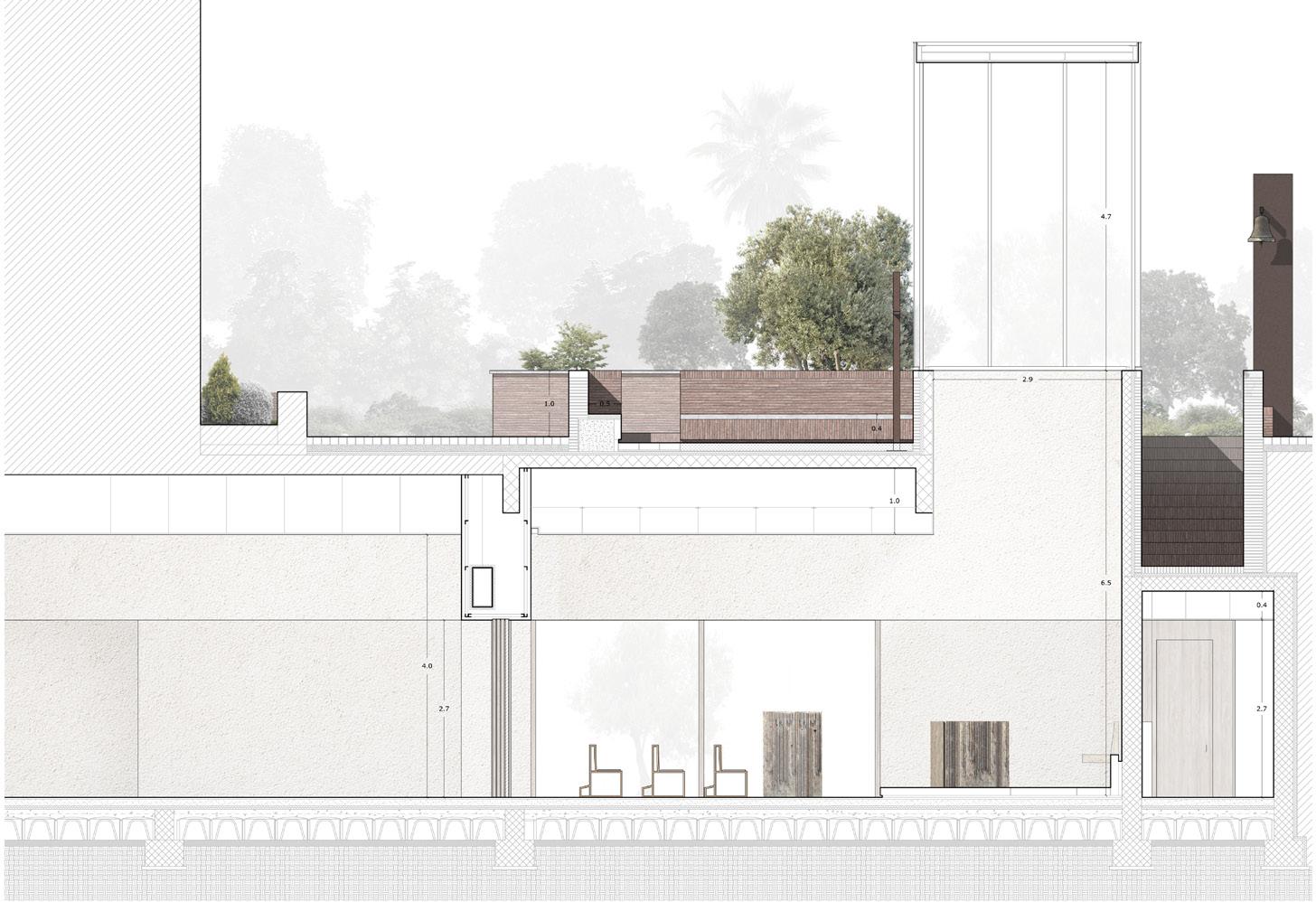 Para vincular estos dos mundos que requieren diferentes lenguajes de expresión, se crea un gran prisma vidriado. Este volumen emerge de la planta baja como continuación vertical del presbiterio hasta captar la luz del exterior. A su vez, la capilla, organizada de forma tangible según dos naves y un espacio central, (modulada por las alturas de los techos), se organiza también de forma inmaterial gracias a la luz natural que entra a través del lucernario.