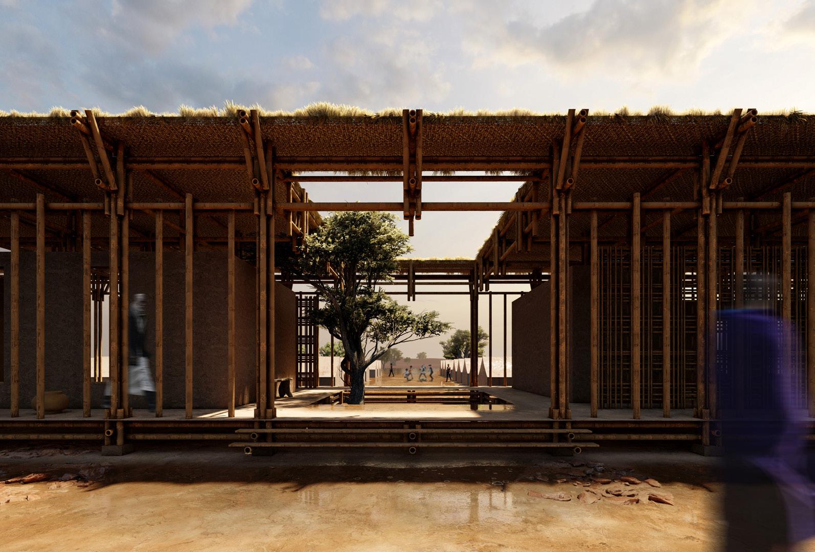 Construido sobre una plataforma de bambú elevada, el edificio se eleva sobre el suelo para garantizar las condiciones de seguridad requeridas. Por su parte, los volúmenes se disponen libremente en esta plataforma, articulándose a lo largo de una serie de patios y espacios resguardados y ventilados.