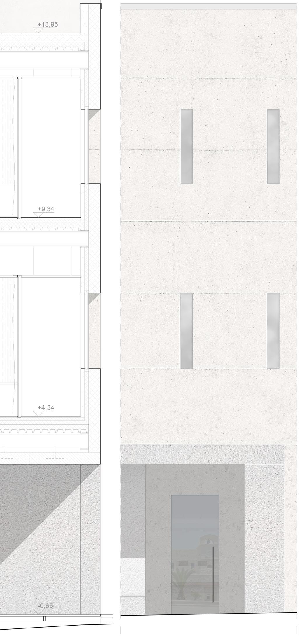 El proyecto es una masa que manifiesta la unidad residencial en la fachada, mientras que el interior es un espacio que ilumina y articula funcionalmente cada vivienda. Se trata de trasladar la tipología casa-patio al edificio de bloques. El interior está fuera.