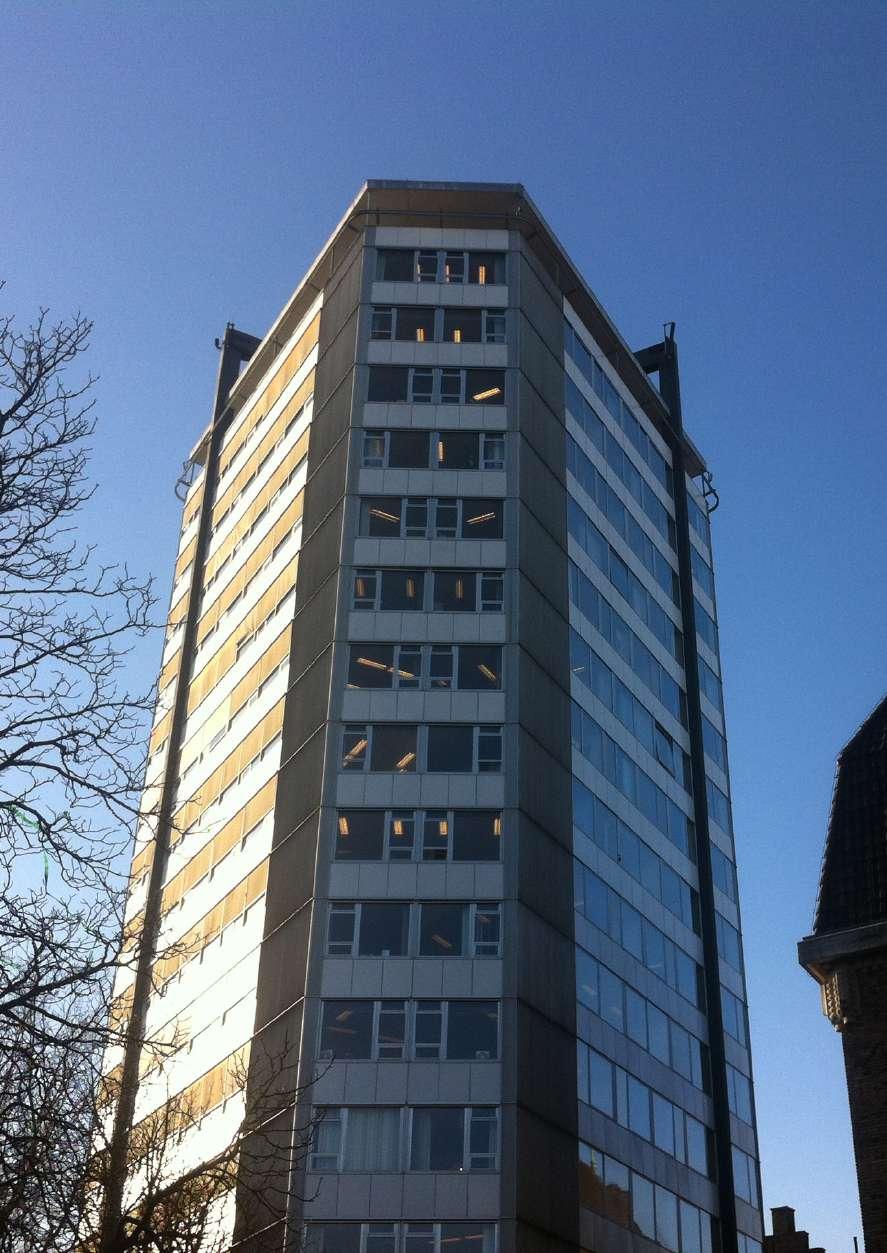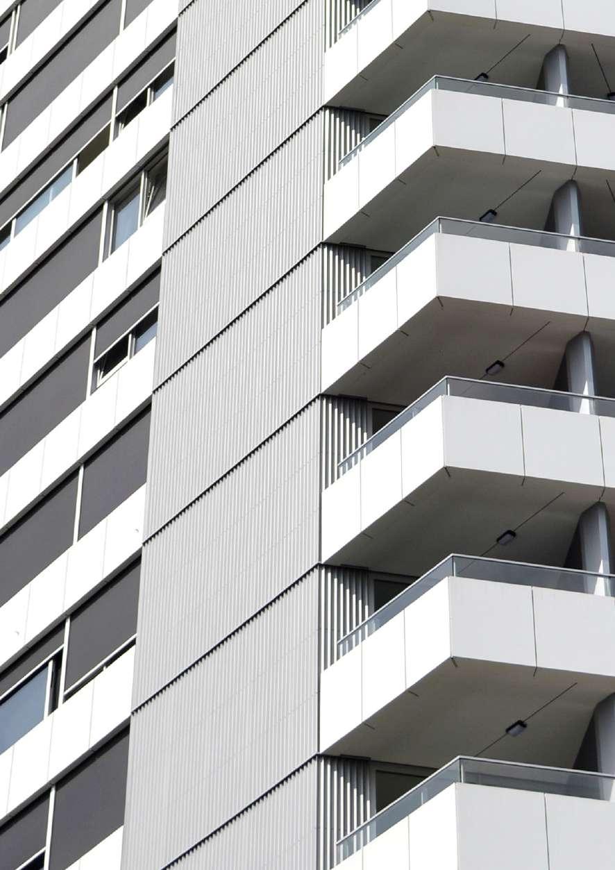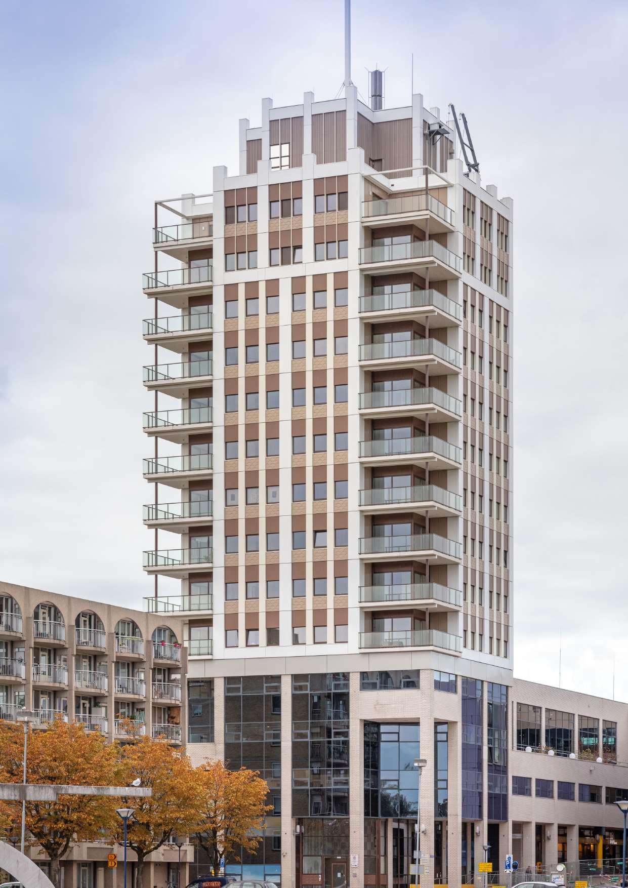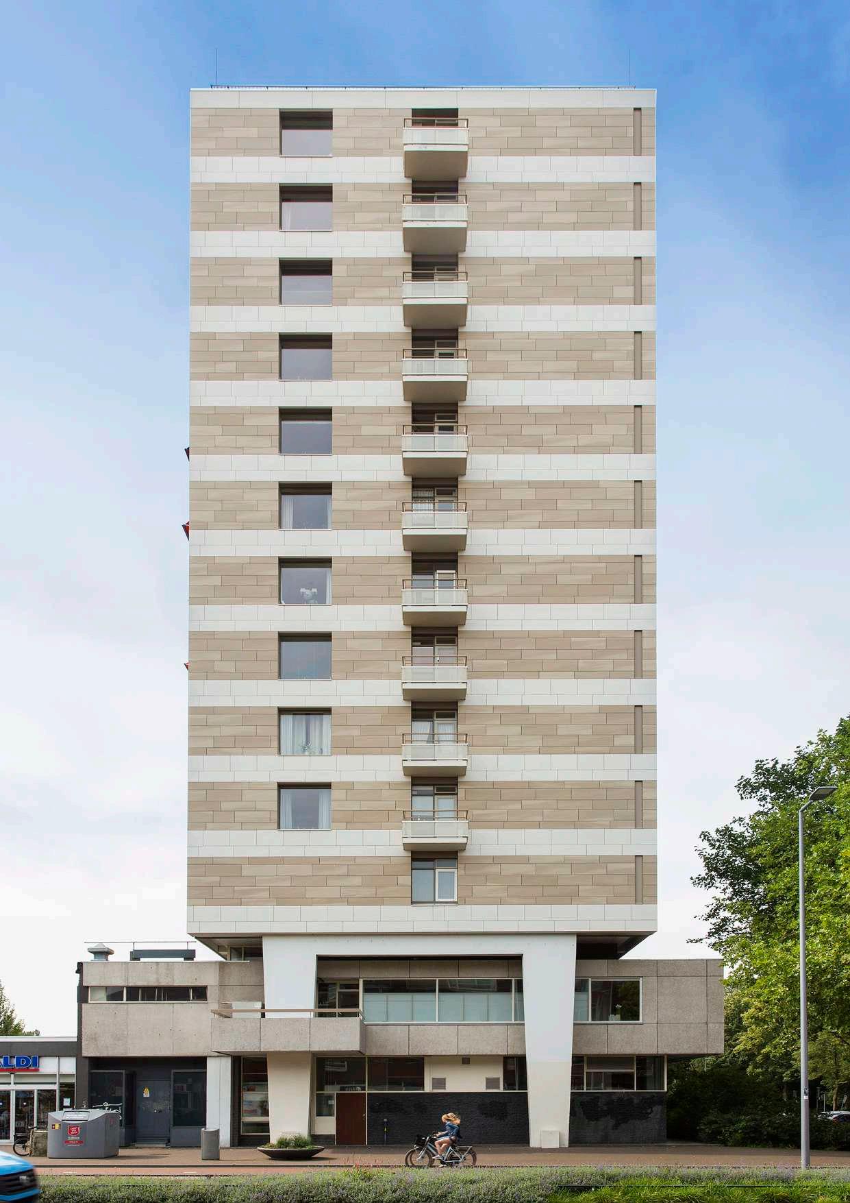 Het onderzoek van de gevelbekleding lag in hoe het gebouw op de verschillende schaal niveau’s werkt. Van veraf als een vlak zodat het de landmark functie van de flat versterkt en van dichtbij het detail wat zorgt voor verfijning en menselijke maat. Daar is de horizontale geleding, middels de lichte banden om aan te sluiten op de balkons, ook van belang. De gekozen lichte kleur zorgt tenslotte voor een fris, nieuw en chique uiterlijk.