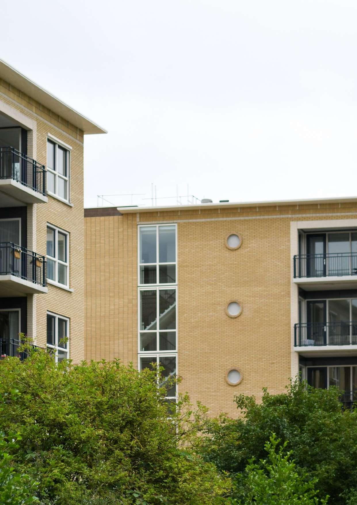 Het ontwerp van de nieuwe appartementengebouwen is een moderne vertaling van Dudok’s iconische stijl. Met een nadruk op de duidelijke driedeling van begane grond, middendeel en bekroning, behouden we de systematiek en esthetische waarde van de oorspronkelijke ontwerpen. De hoge plint en de witte kaders rondom de loggia’s brengen de ritmiek en gevelonderdelen van Dudok terug, terwijl de typische Dudok gele kleurstelling en witte stenen bekroning de historische wortels van de architectuur benadrukken. Deze herinterpretatie versterkt niet alleen de visuele identiteit van het gebied, maar behoudt ook het erfgoed van Moerwijk.