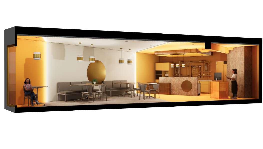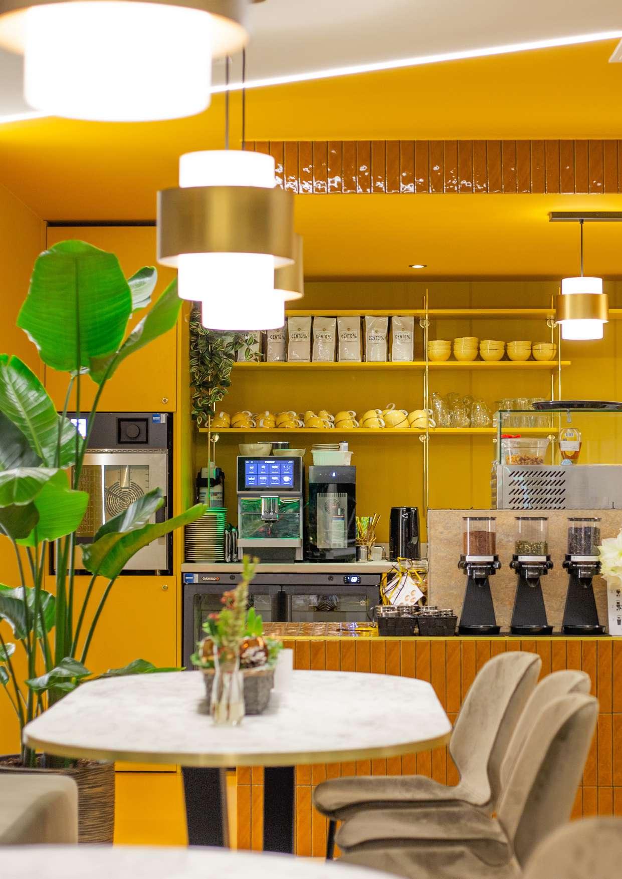 Het interieur van de lunchroom is ontworpen met een fris colorblockconcept, waarbij lichtgrijs en geel de hoofdrol spelen. De combinatie van deze kleuren creëert een speelse en levendige sfeer. Lichtgrijs zorgt voor een rustige basis en comfort bij de zitplekken, terwijl de gele accenten op de gevel en binnenin een uitnodigende en vrolijke uitstraling geven. Deze gedurfde kleurkeuze draagt bij aan een dynamische en aantrekkelijke omgeving die bezoekers verwelkomt en inspireert.