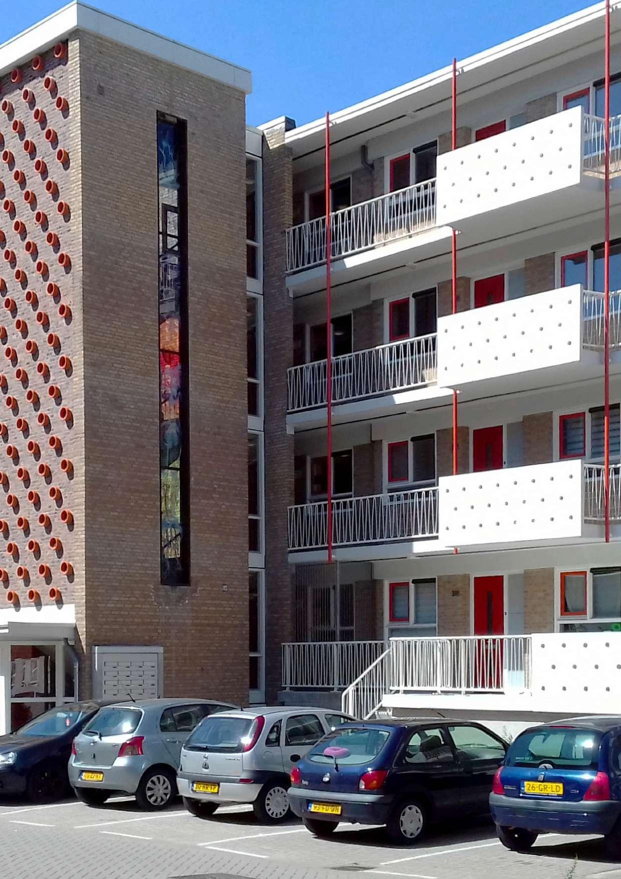 De flat heeft een typisch jaren ’50/’60 uiterlijk. We zien gemetselde kopgevels waarbinnen een duidelijke verdeling van functies plaatsvindt. Het gebouw is vooral vanuit de functionaliteit benaderd en kent daarom een eenvoud in vorm, materiaal en kleur. Er ontstaat een duidelijke structuur: een begin en eind met daartussen een strak ritme waarbinnen de woningen zijn bedacht.