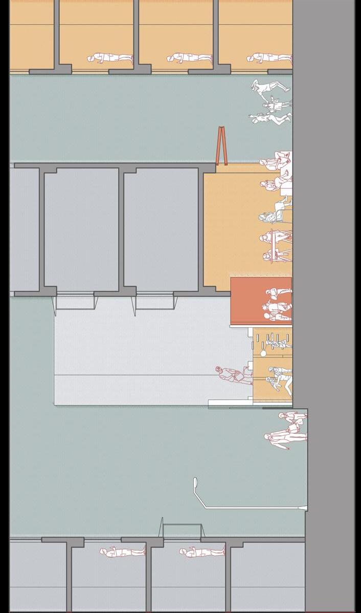 fig.16 串聯城市渠道-四條平行的街道彼此相近,但活動不相連。中間兩條巷弄相較外圍街道較為隱密。 打開兩相鄰商店的後半部、夾著巷弄,合而作為核心活動,在此設置圖書空間,居民可以在這裡讀書、 分享會。而周圍的商店是通向巷弄的次要路徑,也是讓上班族可以在這裡稍作休憩的食堂。