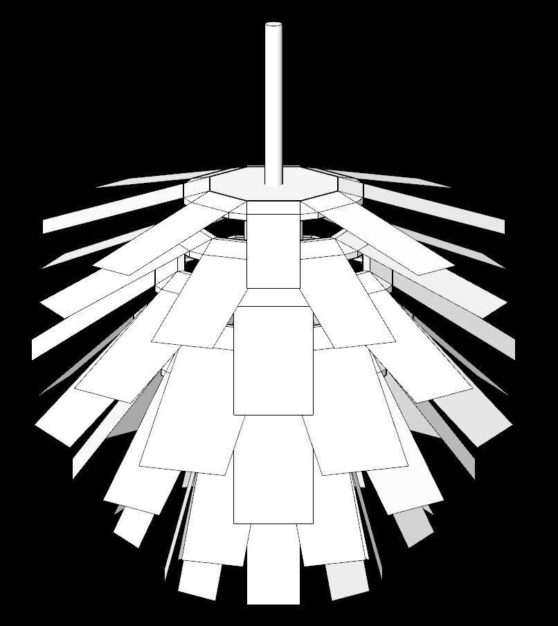 以吸濕可動皮層作為造型燈罩的葉片單元,模仿毬果在乾燥時捲曲、在潮濕時攤平的自然狀態。