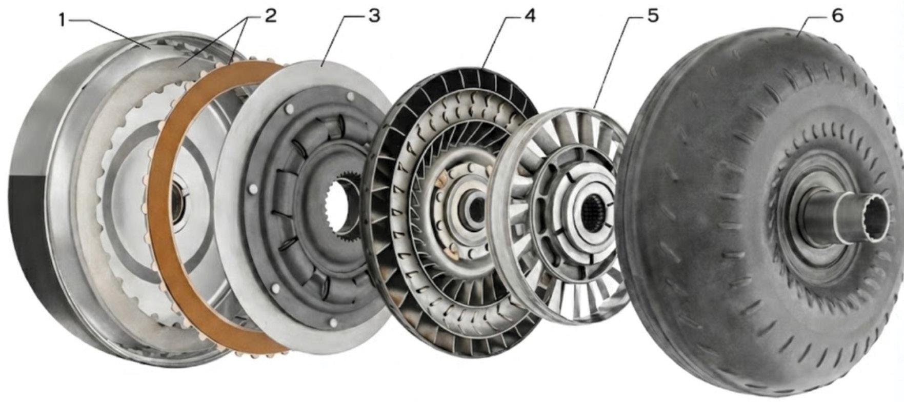 1 – Torque converter front cover, 2 – Clutch friction discs, 3 – Clutch pressure disc with torsional damper, 4 – Turbine, 5 – Stator, 6 – Impeller housing.