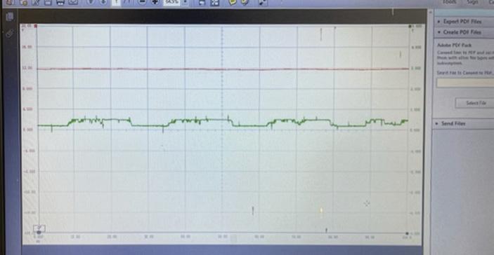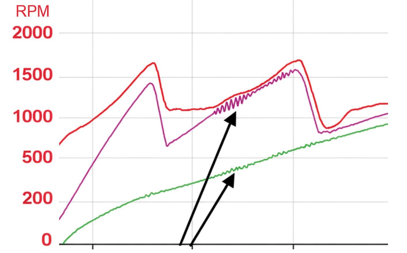 Red = Engine speed, Purple = Input-shaft speed, Green = Output-shaft speed. This is clear TCC shudder, giving that rumble-strip feeling.