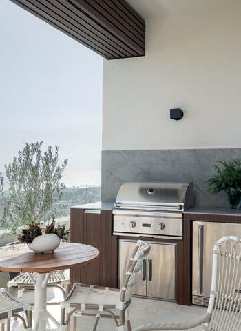 La cocina fría se diseñó con dos tonos contrastantes, madera oscura y taupe liso, empleando el mismo mármol para topes y respaldos. La isla exhibe una geometría moderna que da espacio a la socialización al conectar directamente con la terraza principal y con el área de comedor exterior, donde se encuentra también la barbacoa.